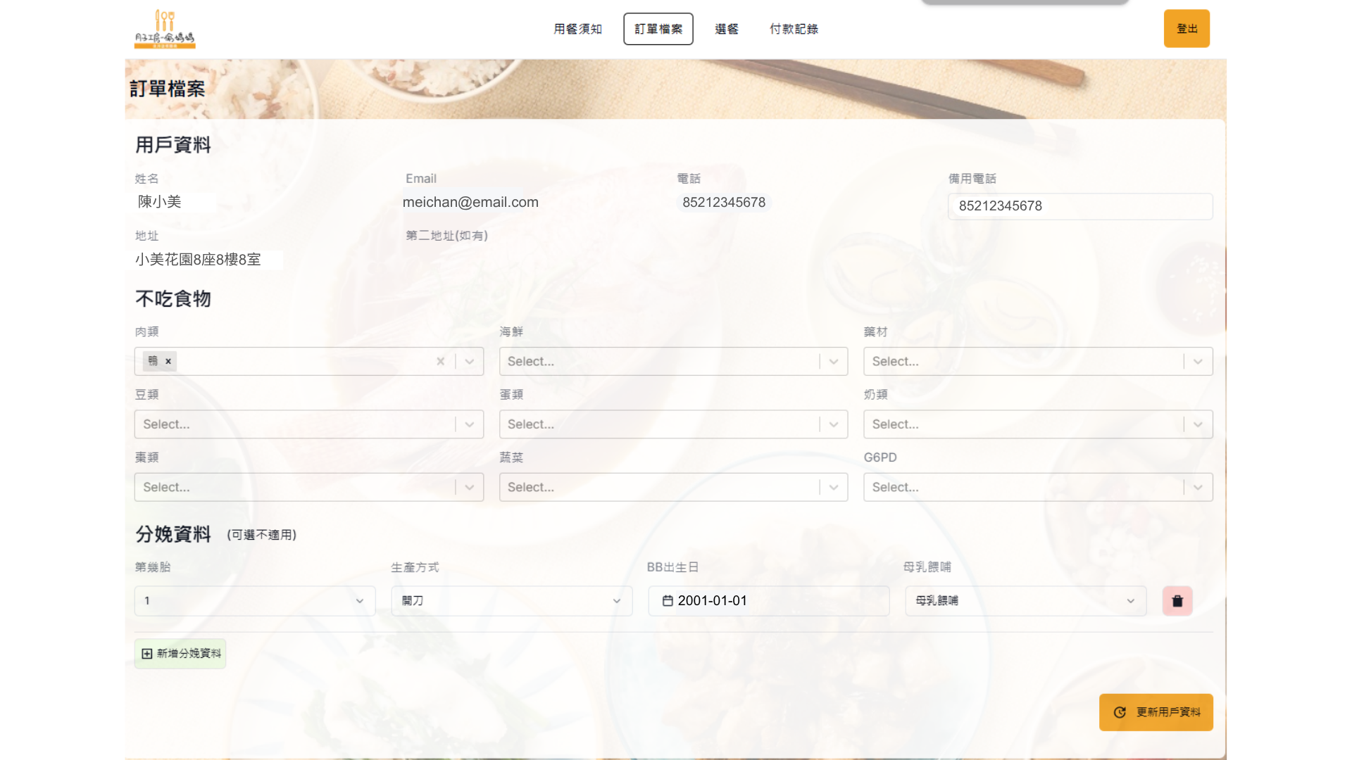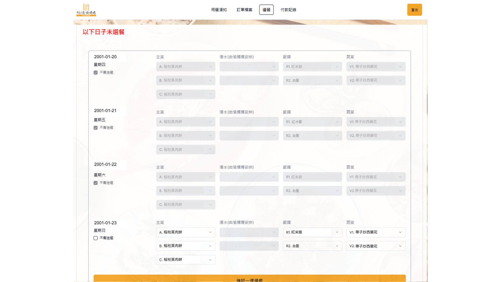 A simple member portal for diners. After logging in, customers browse the AI-curated meal plan and pick what they want to eat — payment is generated by the CRM and confirmed via FPS, so the experience stays clean and friction-free.